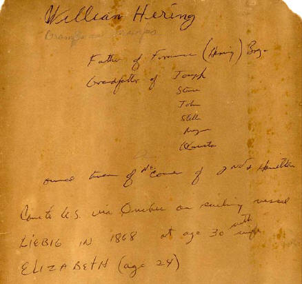 Hering Family Ella Elizabeth (Weska) Palczewski's Grandpa and Grandma Wilhelm (William) and Elizabeth Hering came from Poland to Quebec on the sailing vessel "Tiebig." They were listed as Farmer and Wife ages 30 and 24. On the ship were 330 adults, 150 children, and 56 infants (under 1). The ship left from Hamburg, Germany May 1, 1868. (Information from Father Paul Breza, 1997) William Ambrose Herring was born March 21, 1838 in Besitzer