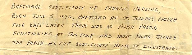 Immigration records.) Conclusions: William and Elizabeth immigrated to Minnesota in 1868. Daughter Mary was not born in Winona but elsewhere in Minnesota. Son Jacob was born in Wisconsin in 1870 but there is no record as it was not required until 1907. Frances was also born in Minnesota but not in Winona County. Fact: William Herring was first listed in the Winona City Directory in 1875. Occupation was Night Watchman for the Winona and St. Peter Rail Road. Property was purchased January 1877. In 1883, 1884, 1885 City Directory, William was listed as the owner of a grocery and saloon. (He died June 5, 1884 at the age of 44.) From 1880 to 1885, Ferdinand Herring was listed as a clerk for William. After this time there is no listing for him. May 1, 1885 State Census: Winona County Courthouse Records It is not known what