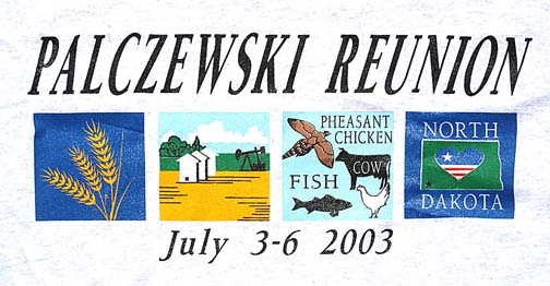Reunion T-shirts are designed by Kim Jore. T-shirts can be purchased through Dales Clothing in Bowman, ND at 701-523-3620 as of June 20th. Cost is $12.72 per shirt which includes tax. All shirts are ash grey in color. Dale's Clothing will be closed on Friday, July 4th. Lodging All five Dry Creek Cabins at the Bowman Haley Dam have been reserved for our Reunion. The cabins sleep up to six people and have electricity, a refrigerator, microwave, water cooler, table and chairs. Our rate is $25/night for July 3 - 5. Cabins have been reserved for: Tim & Dorothy Gilmore, Stan Jr. & Jill, Chris & Meg Conlon, Dave & Lucy Barta, and Oistein & Pat Nyberg. The Bowman Haley Dam Marina sells food and beverages and has showers and restrooms. Eight RV hookups have been reserved at the Bowman Hailey Dam. Electricity is at the site. Water and dump station are near the Marina. Contact Dianne Morley. Camping around the dam is free. Ten rooms at the North Winds Lodge, Bowman have been reserved until January 1, 2003. The Palczewski rate is single $38/night or double with two beds at $48/night. Ron and Sheila Palczewski highly recommend this motel. Contact the North Winds Lodge at 1-888-684-9463 or 701-523-5641. El-Vu Motel, Bowman, 701-523-5224 Websites www.BowmanND.com